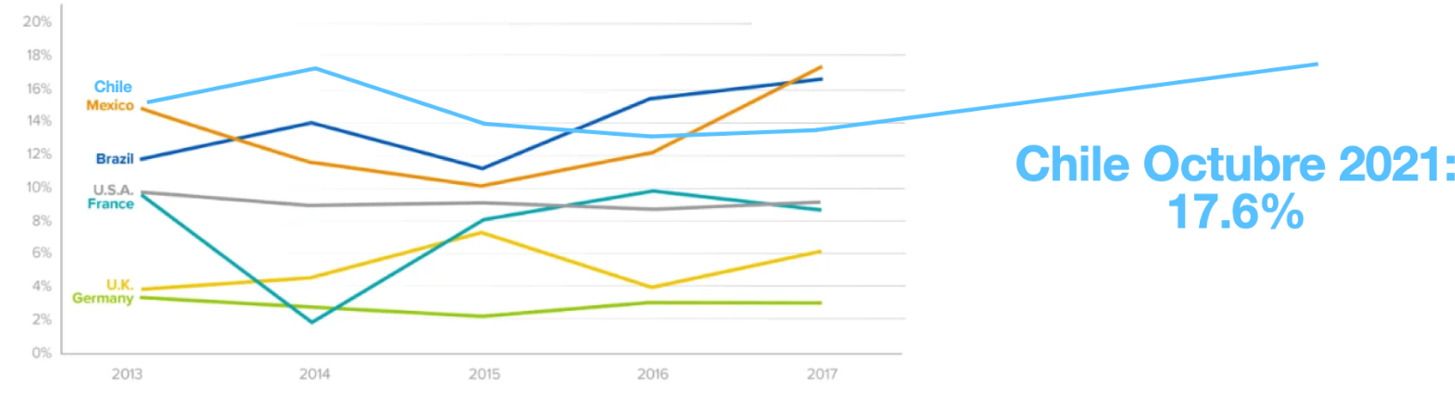En el gráfico de abajo pueden ver el ROE (rentabilidad sobre el patrimonio) de la industria bancaria en 7 países, 4 desarrollados y 3 en vías de serlo. El ROE es una medida que refleja la rentabilidad de la inversión que hicieron los accionistas. Las diferencias son claras: en países desarrollados la industria bancaria tiene un ROE que parte casi en 2% (Alemania) y llega a 10% (Estados Unidos); en los países Latinoamericanos, en cambio, el ROE oscila entre 12% y casi 18%. ¡Cualquiera quisiera una inversión con rentabilidad anual de 18!