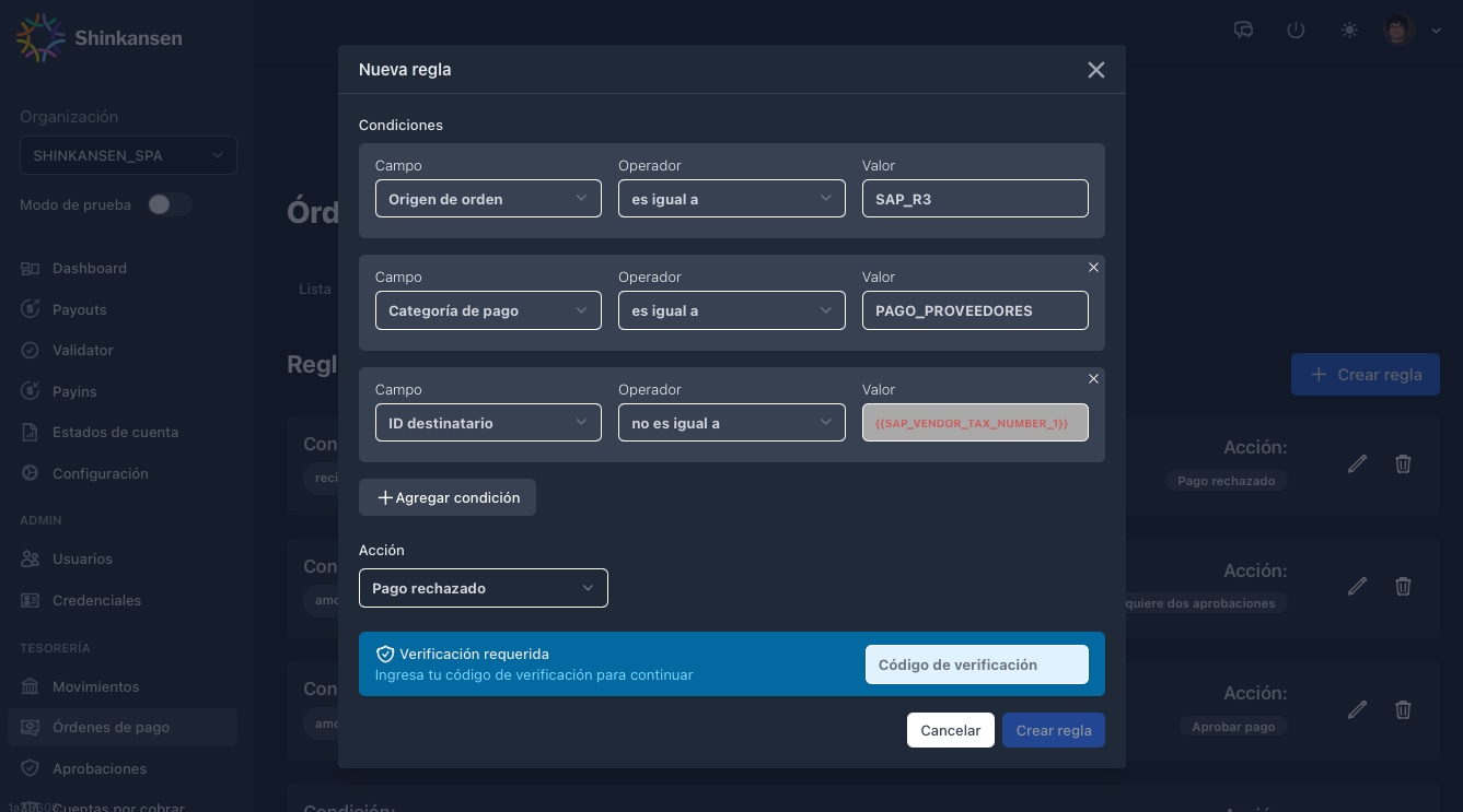 - Ponemos esa información en nuestra plataforma para que las personas que toman decisiones aprueben o revisen pagos (o hagan auditorías eficientes, olvídate de usar un PDF para revisar que pasó). Usamos mucha tecnología para mostrar la información relevante y detectar patrones pero manteniendo el rol de las personas que toman las decisiones y la responsabilidad sobre esas decisiones. O meta-decisiones. Ejemplos sencillos que se pueden configurar con pocos clicks en Shinkansen Treasury: